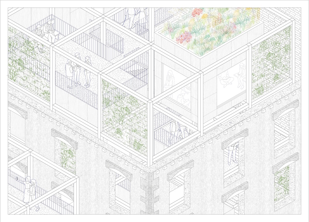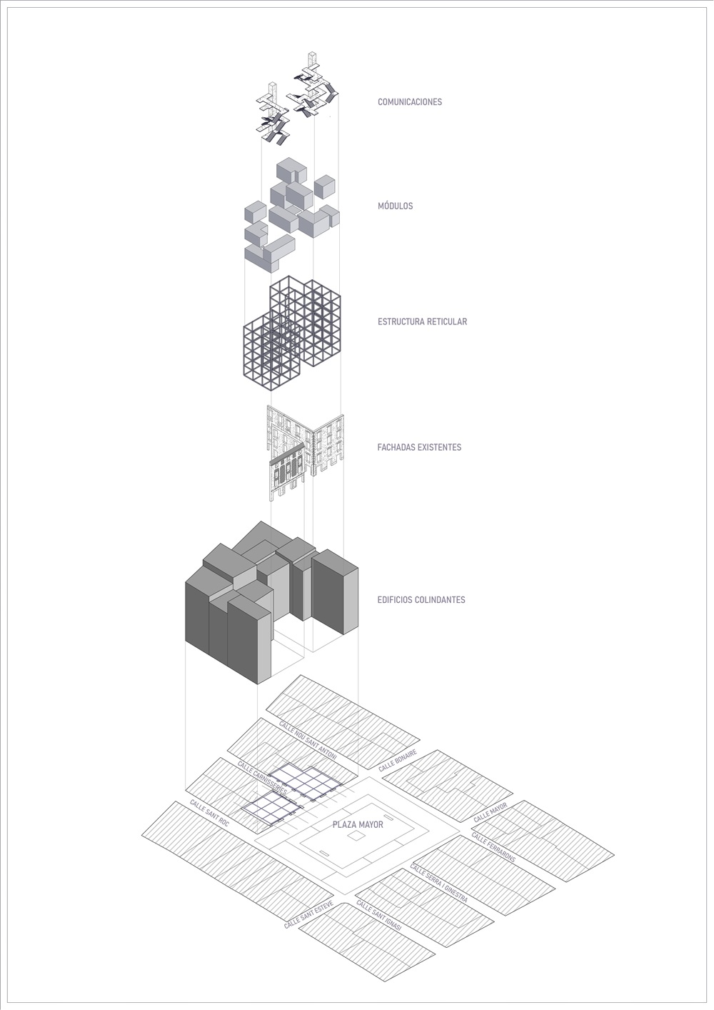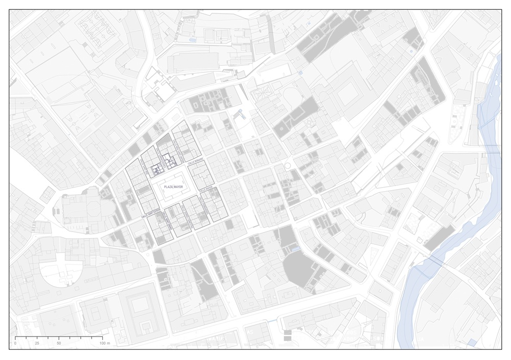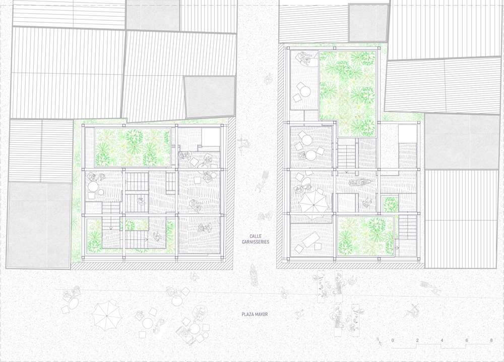 Ante esta situación, la propuesta no busca añadir nueva edificación ni alterar la imagen consolidada de la plaza, sino ensancharla simbólicamente hacia el interior del tejido existente. Para ello, se recuperan dos edificios actualmente abandonados, situados uno frente al otro en la calle de las Carnisseries, concebidos como una extensión interior de la Plaza Mayor. La intervención actúa desde el vacío, generando nuevos espacios públicos interiores que complementan a la plaza y amplían su capacidad de acogida desde dentro de la ciudad construida.