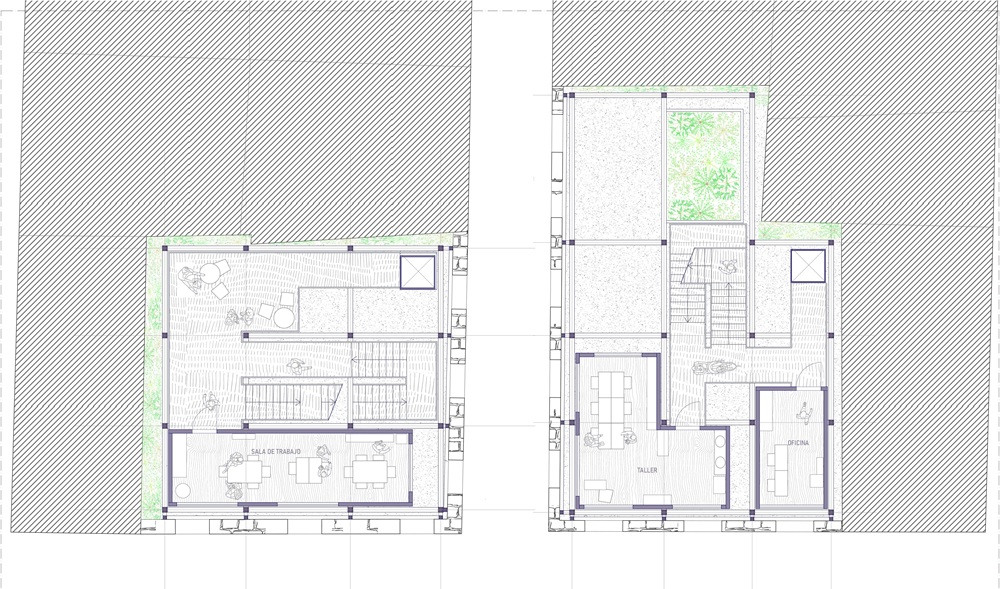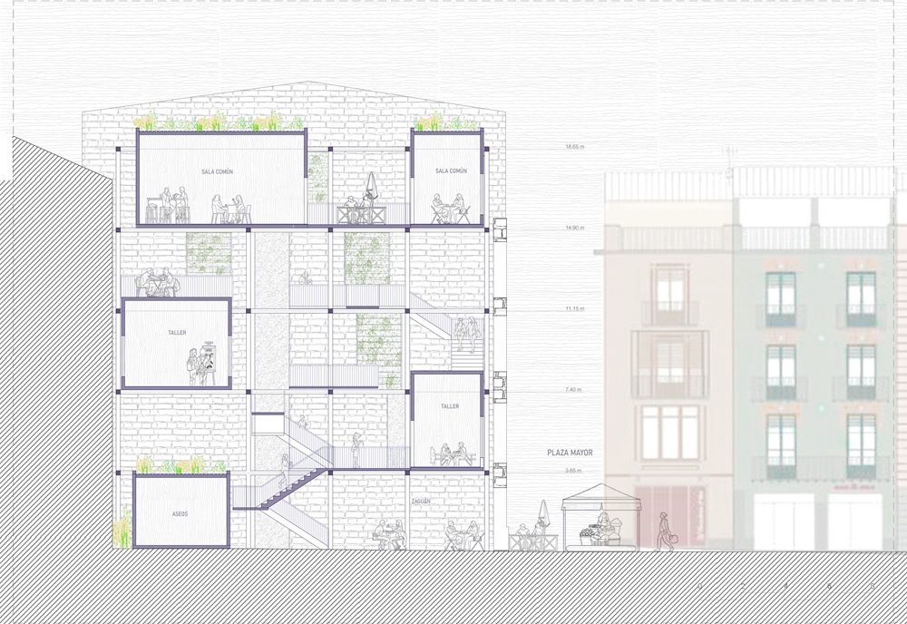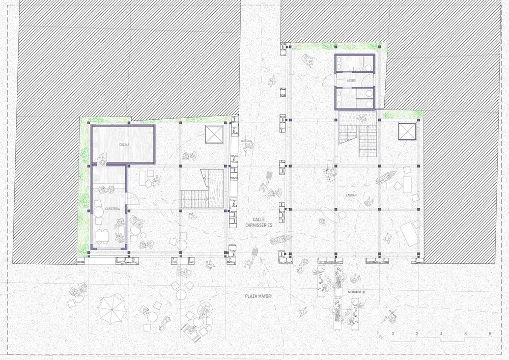 La planta baja y el zaguán se conciben como una prolongación directa de la Plaza Mayor, permitiendo que el pavimento y la actividad urbana penetren en el interior de los edificios. El mercado artesanal puede extenderse parcialmente hacia estos espacios intermedios, mientras que la cafetería se plantea como un comercio local que favorece la permanencia, la socialización y la continuidad de la vida urbana cotidiana.