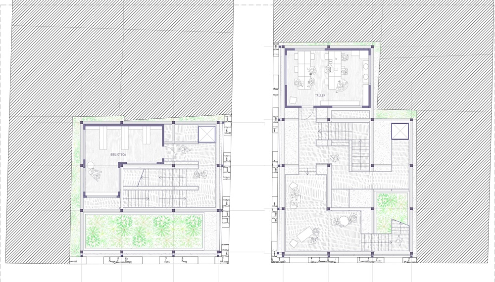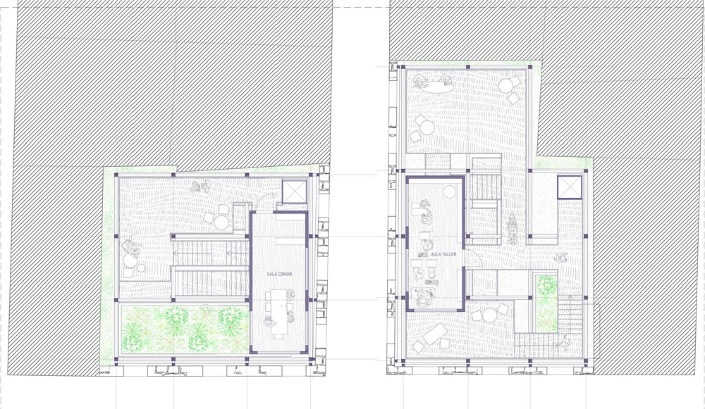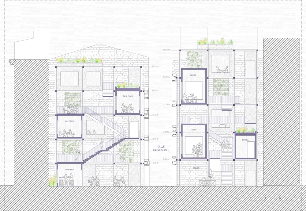 Los dos inmuebles se plantean como un sistema complementario basado en la dualidad pensar y hacer. En Carnisseries 1 se desarrolla la Casa del Pensar, un espacio social, cultural y de encuentro que acoge usos tranquilos, reflexivos y colectivos, vinculados a la pausa, la conversación y la vida comunitaria. En Carnisseries 2 se sitúa la Casa del Fer, un espacio de producción y creación artesanal que introduce un taller urbano abierto al público, devolviendo al centro histórico un uso activo, participativo y ligado a la producción local.